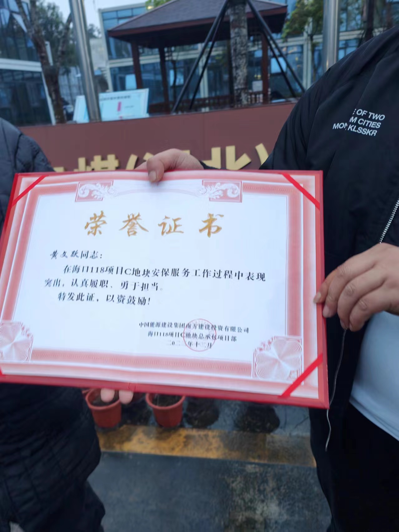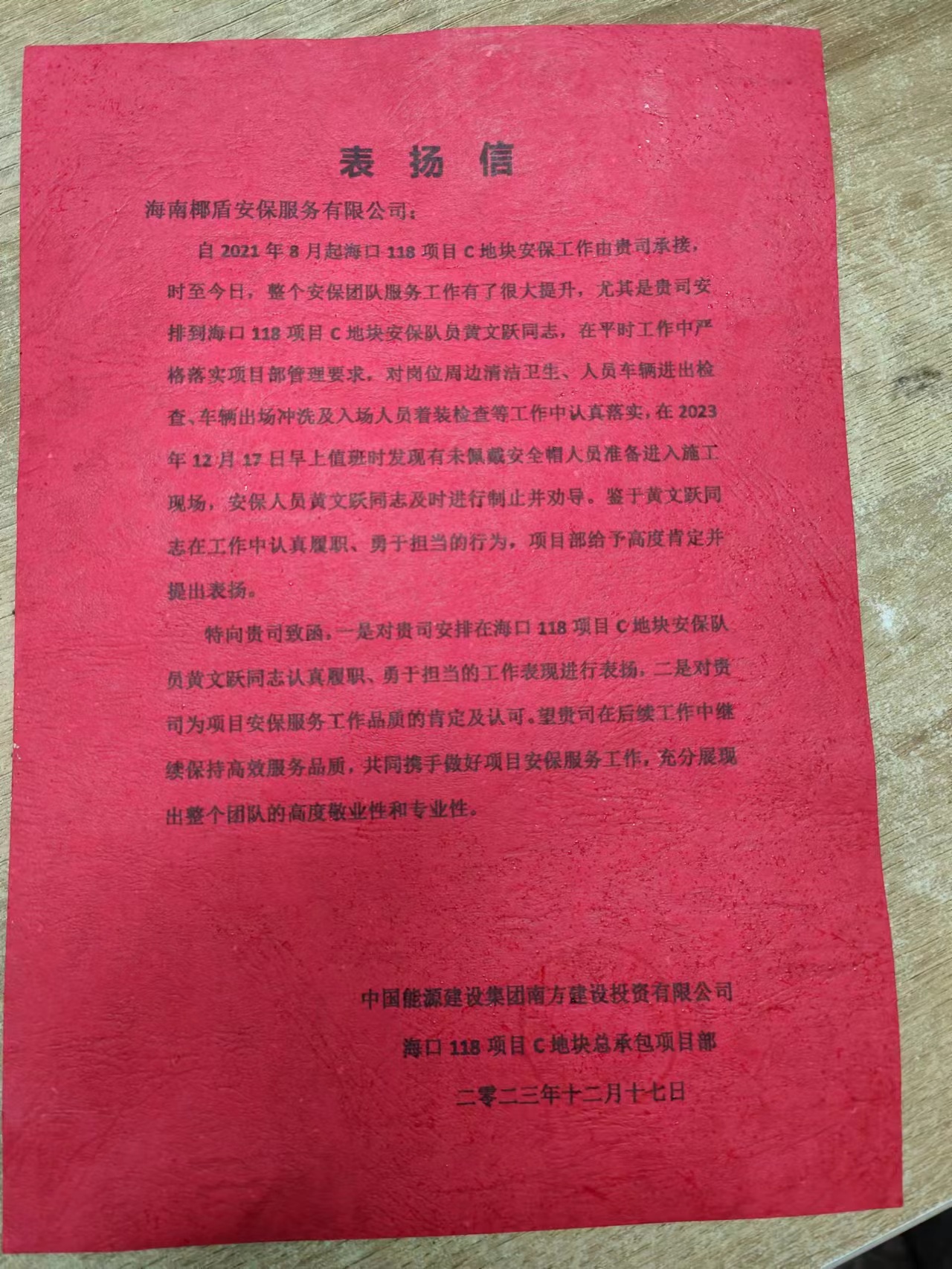 近日,我司駐勤海口118項(xiàng)目C地塊安保隊(duì)員黃文躍同志,收到駐勤項(xiàng)目中國能源建設(shè)集團(tuán)南方建設(shè)投資有限公司發(fā)來的表揚(yáng)信及榮譽(yù)證書。他在崗位上的卓越表現(xiàn)贏得了甲方的一致認(rèn)可。信中提到黃文躍同志在平時工作中嚴(yán)格落實(shí)甲方單位項(xiàng)目部的管理要求,對崗位周邊清潔衛(wèi)生、人員車輛進(jìn)出檢查、車輛出場沖洗及入場人員著裝檢查等工作認(rèn)真落實(shí)。面對緊急情況,他迅速反應(yīng),妥善處理,有效避免了潛在的損失和風(fēng)險(xiǎn)。他的敬業(yè)精神和無私奉獻(xiàn),不僅保護(hù)了甲方單位的財(cái)產(chǎn)安全,更是維護(hù)了員工的人身安全。
